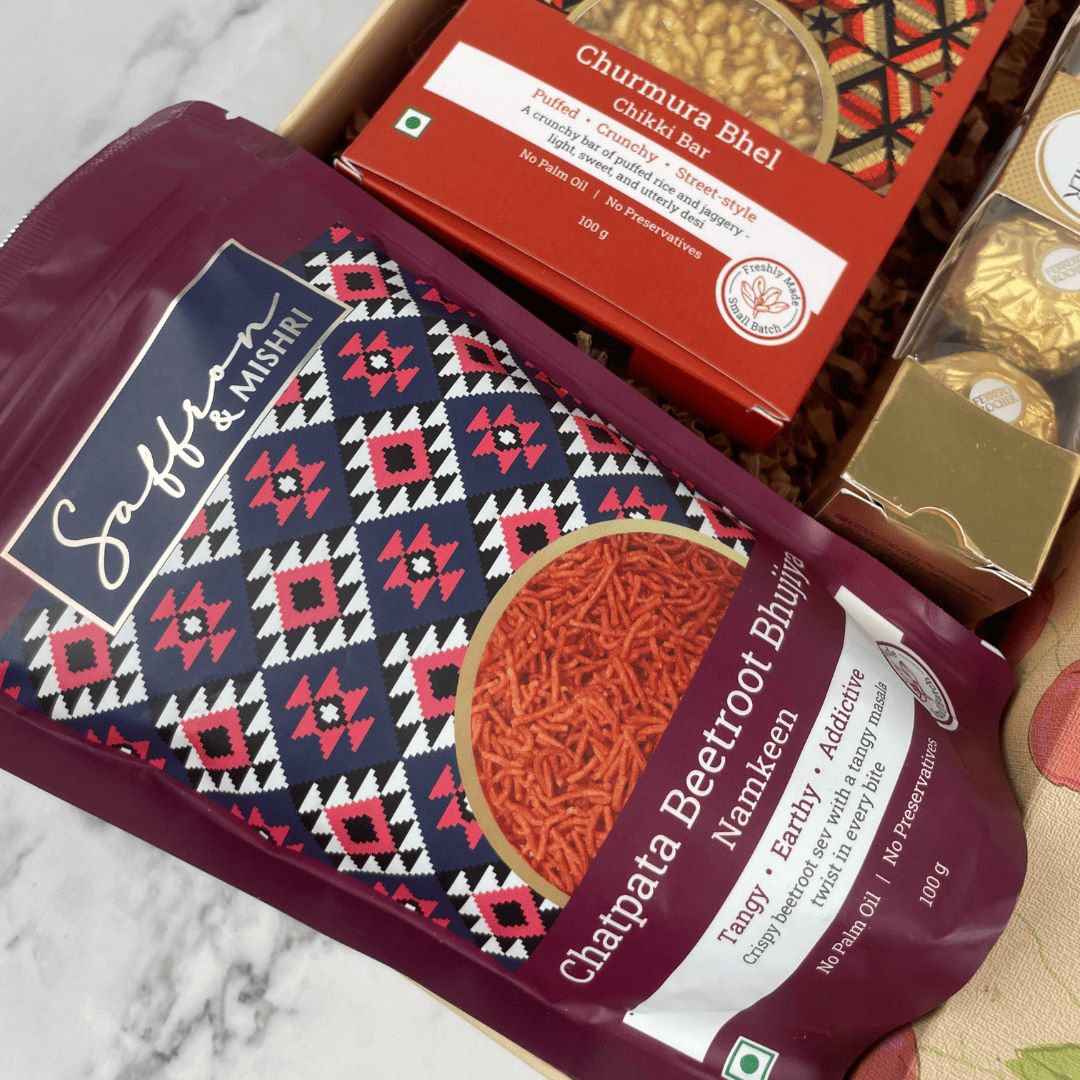 | Snacks Included | Beetroot Bhujiya Namkeen, Churumura Bhel (Chikki Bar) |
