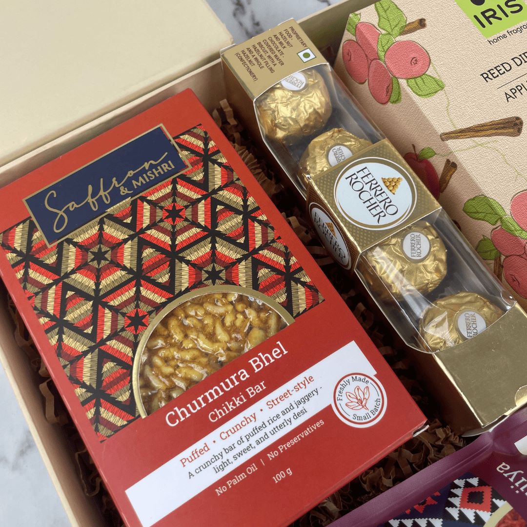 Celebrate joyful moments with this thoughtfully curated Festive Snack & Aroma Gift Hamper, a perfect blend of flavour, fragrance, and indulgence. Designed to delight the senses, this hamper brings together crunchy Indian snacks, premium chocolates, and a soothing home fragrance to create a warm festive experience.