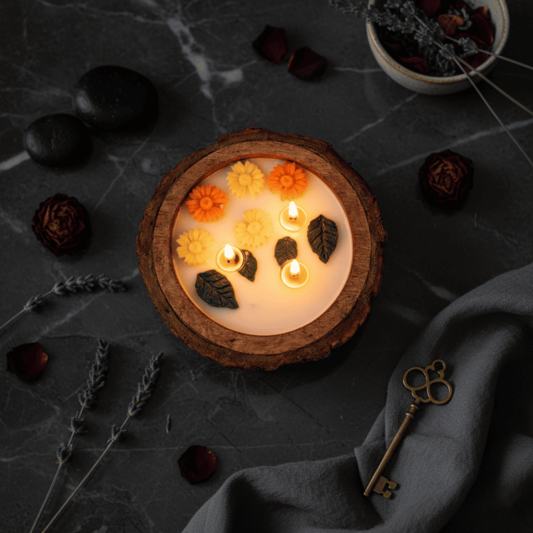 | Design | Floral Wax Candle in Complete Wooden Bowl |