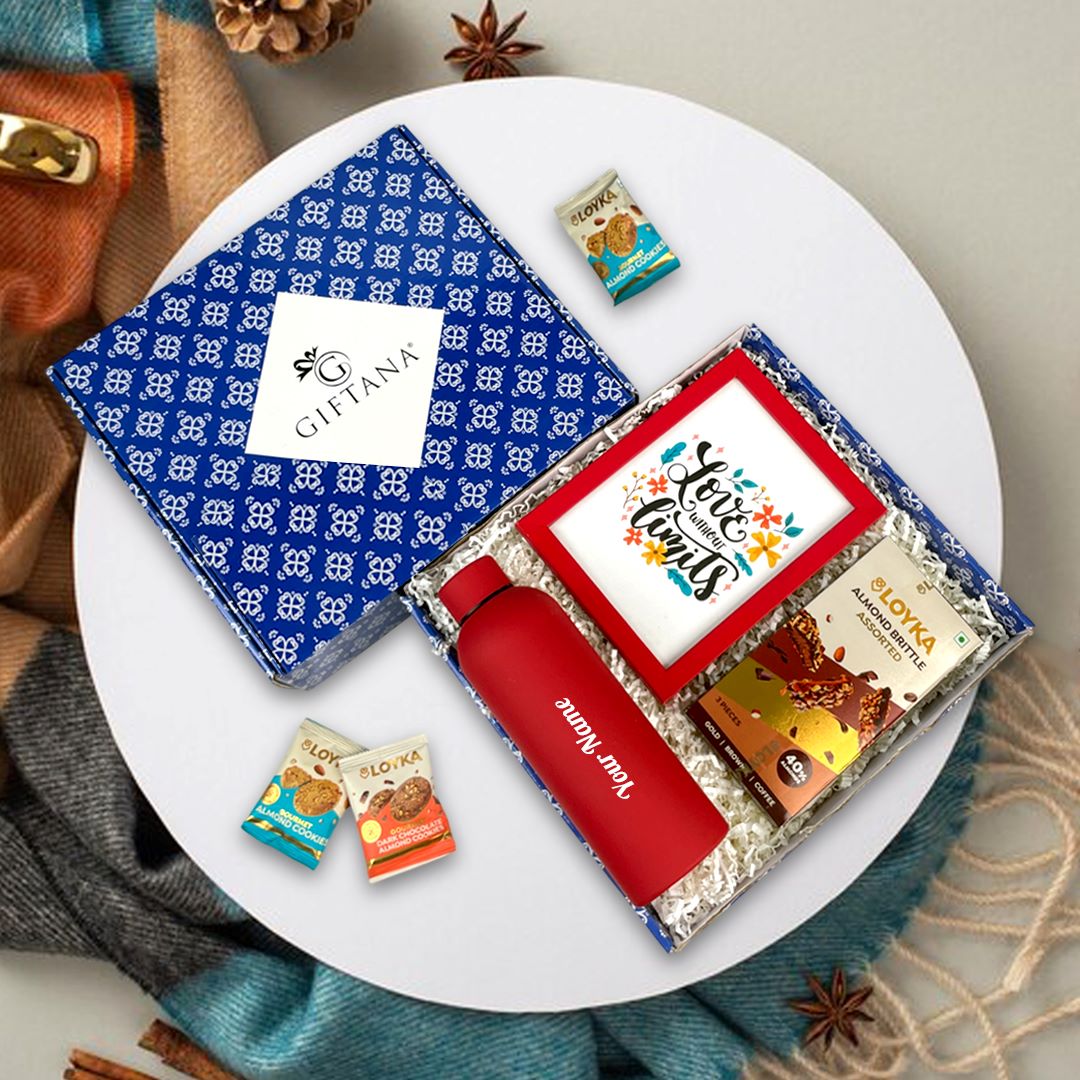 Designed to create joy and lasting impressions, this hamper is ideal for both personal gifting and corporate celebrations. The reusable water bottle supports an eco-conscious lifestyle, the photo frame preserves your favorite moments, and the Loyka brittle adds a delicious festive touch. Together, they create a perfect balance of practicality and celebration in one premium gift box.
