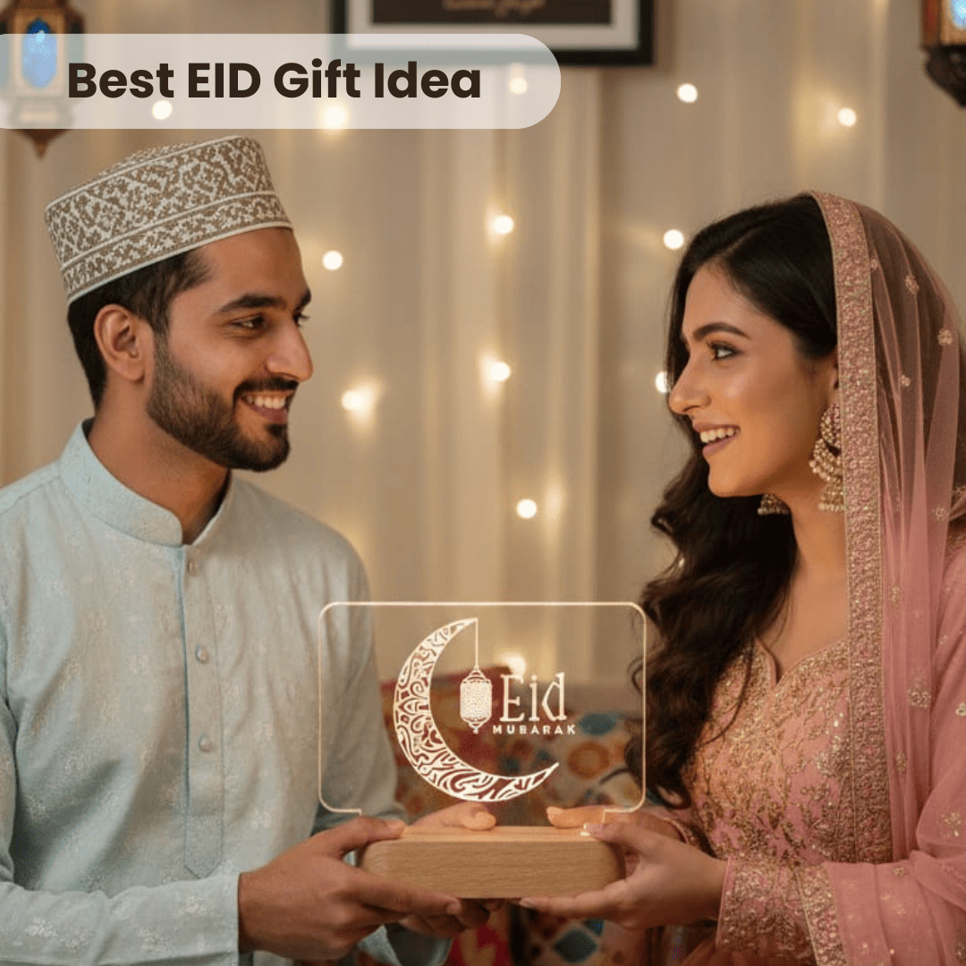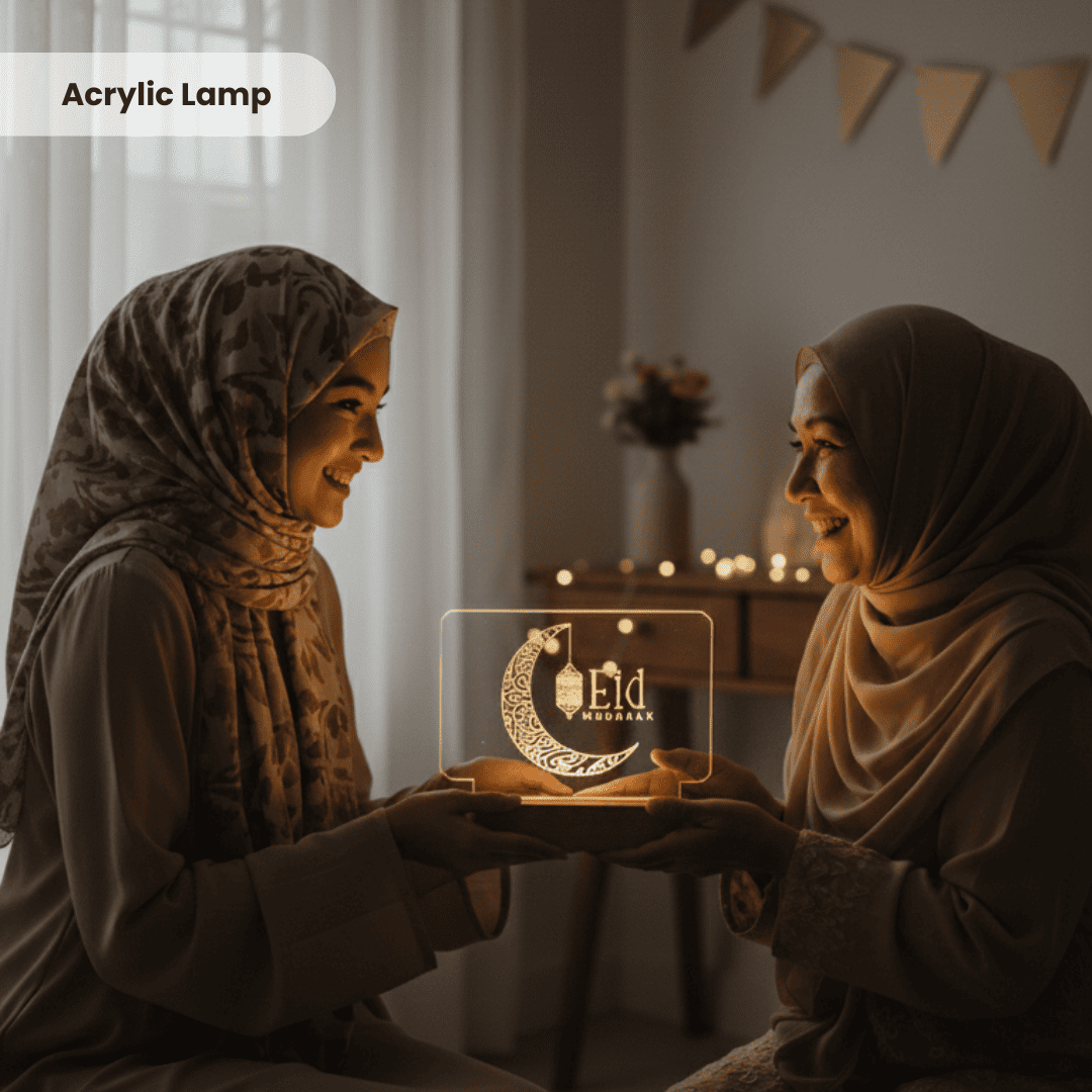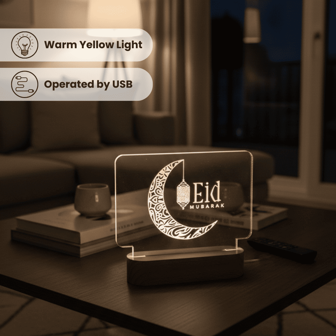 A stylish acrylic lamp with a wooden base that beautifully illuminates the Eid Mubarak crescent design, creating a cozy festive atmosphere for living rooms or bedrooms.