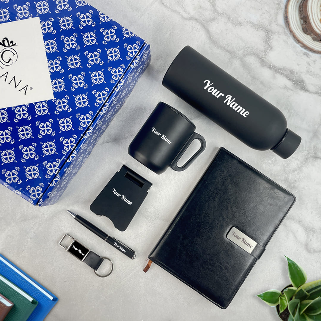 A premium all-black personalised gift set curated for everyday use, work, travel and thoughtful gifting. This stylish 6-piece personalised set includes a rubber bottle, ceramic mug, diary, pen, keychain and mobile stand - each customised with your name for a luxurious, cohesive look.