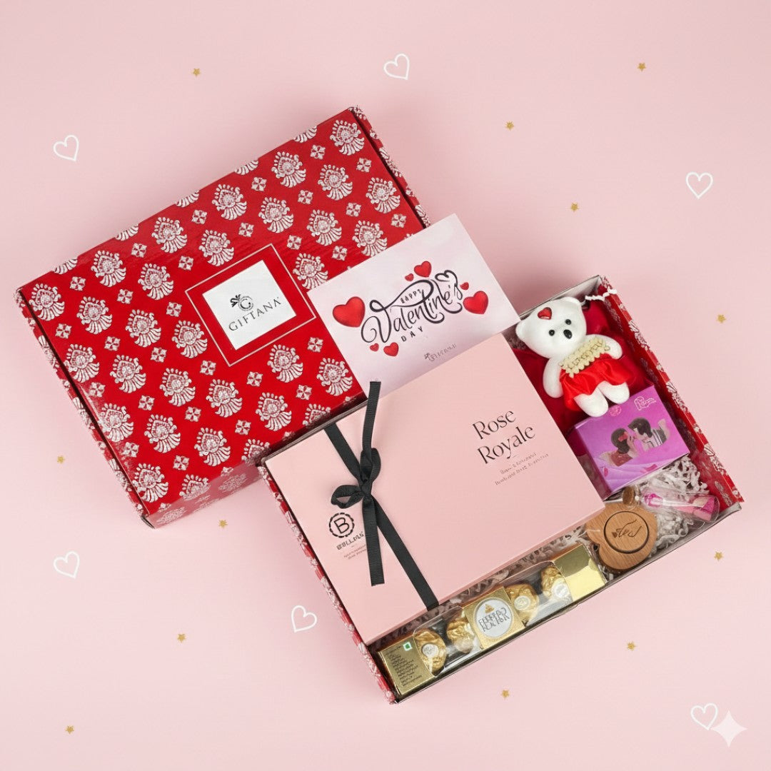 | Contents | Rose Royale Pack of 3, Teddy Bear, Kissing Dolls, Message Bottle, Heart Keychain, Ferrero Rocher (Pack of 4), Valentine Card |
