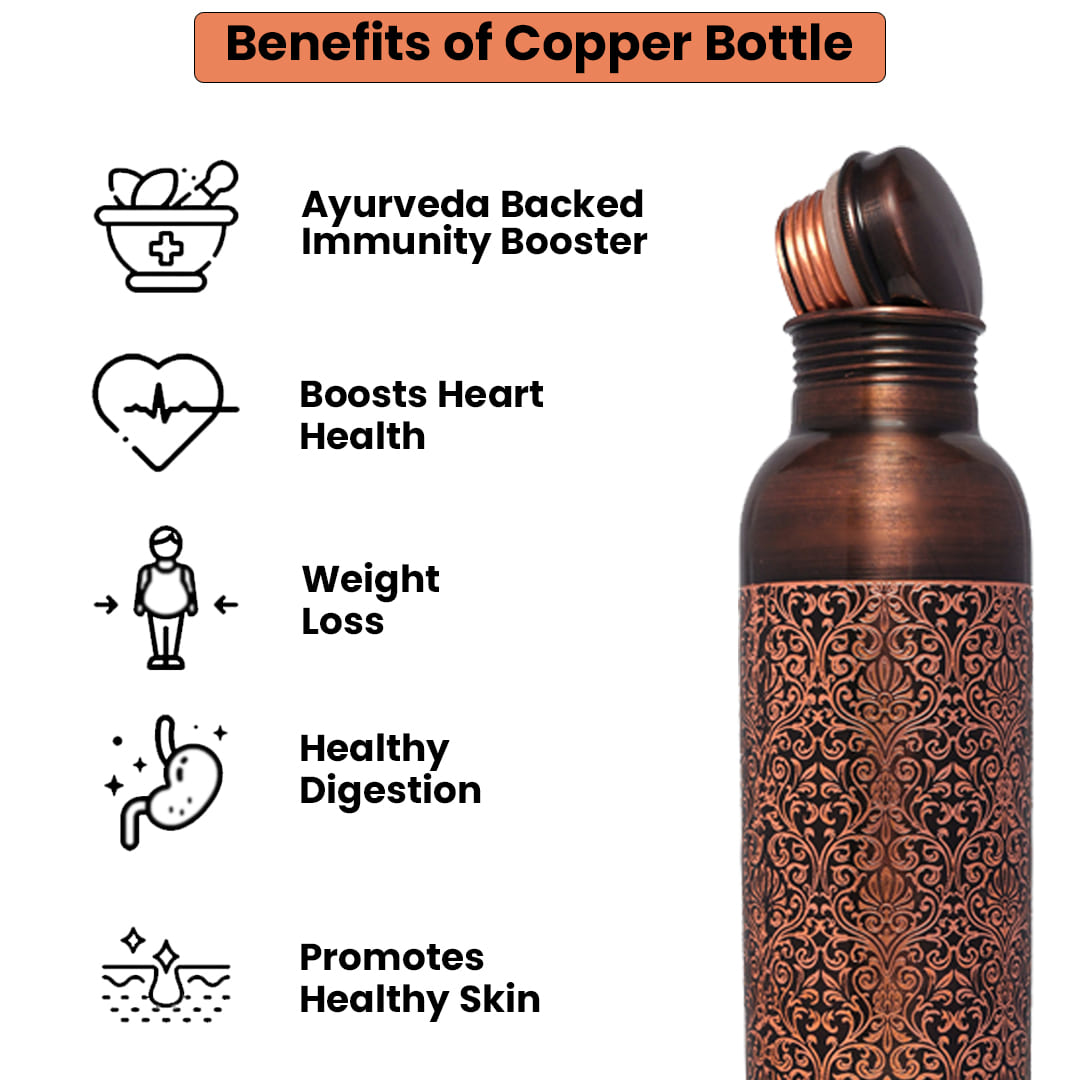Designed with heritage-inspired engravings, this copper bottle celebrates traditional design while offering a durable and functional everyday essential. Its elegant appearance makes it suitable not only for personal use but also as a thoughtful keepsake for special moments.