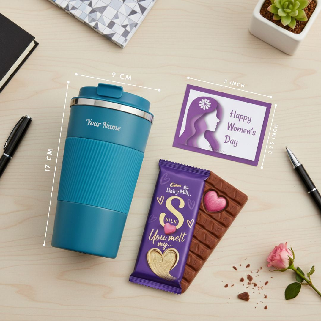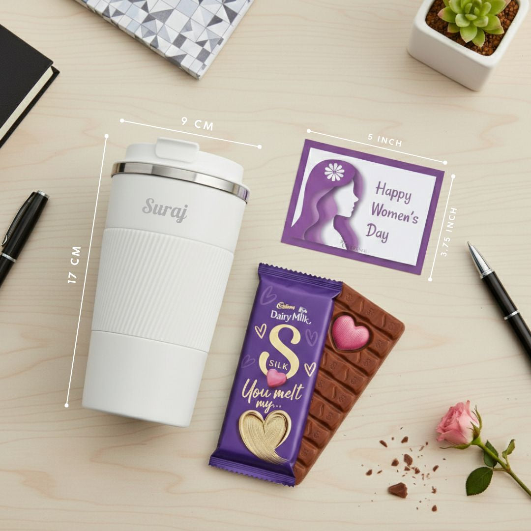 This elegant Women’s Day Self Care Gift Set features a premium insulated travel tumbler with laser engraving personalization, a delicious silk chocolate, and a beautiful Women’s Day card - all packed inside a minimal white corrugated gift box for a premium unboxing experience.