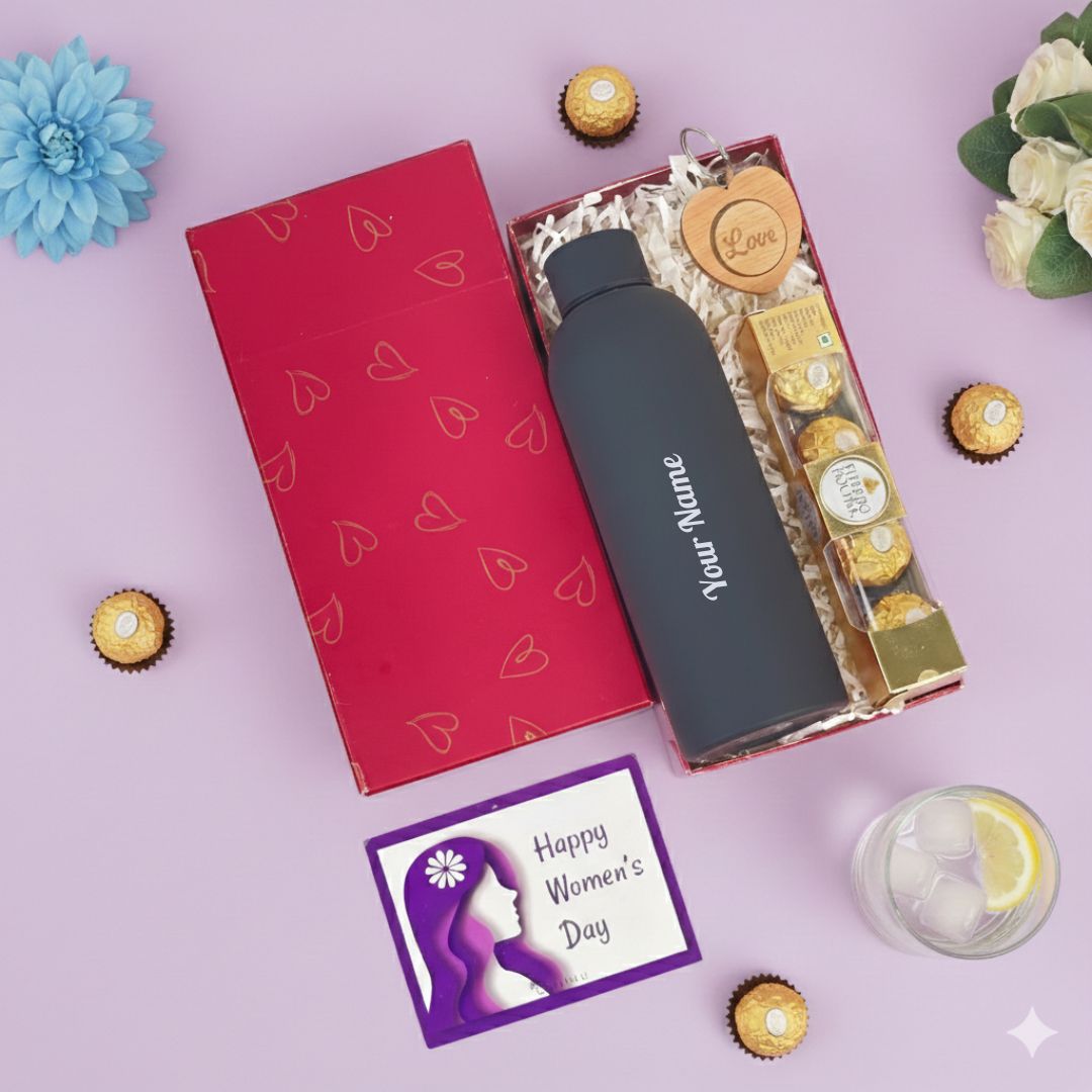 Featuring a premium rubber-finish insulated bottle customized with her name, delicious chocolates, a heart-shaped wooden keychain, and a beautifully designed Women’s Day card - all packed inside a red heart top-bottom gift box for the perfect surprise.
